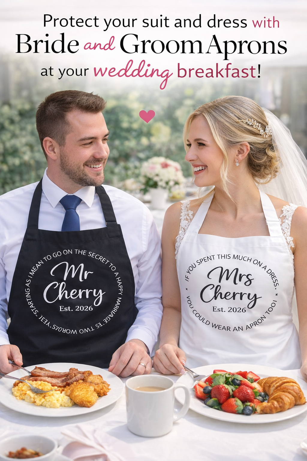 Make your wedding breakfast stress-free, fun and photo-ready with our Bride & Groom Apron Set — because if you can wear an apron… why wouldn’t you?